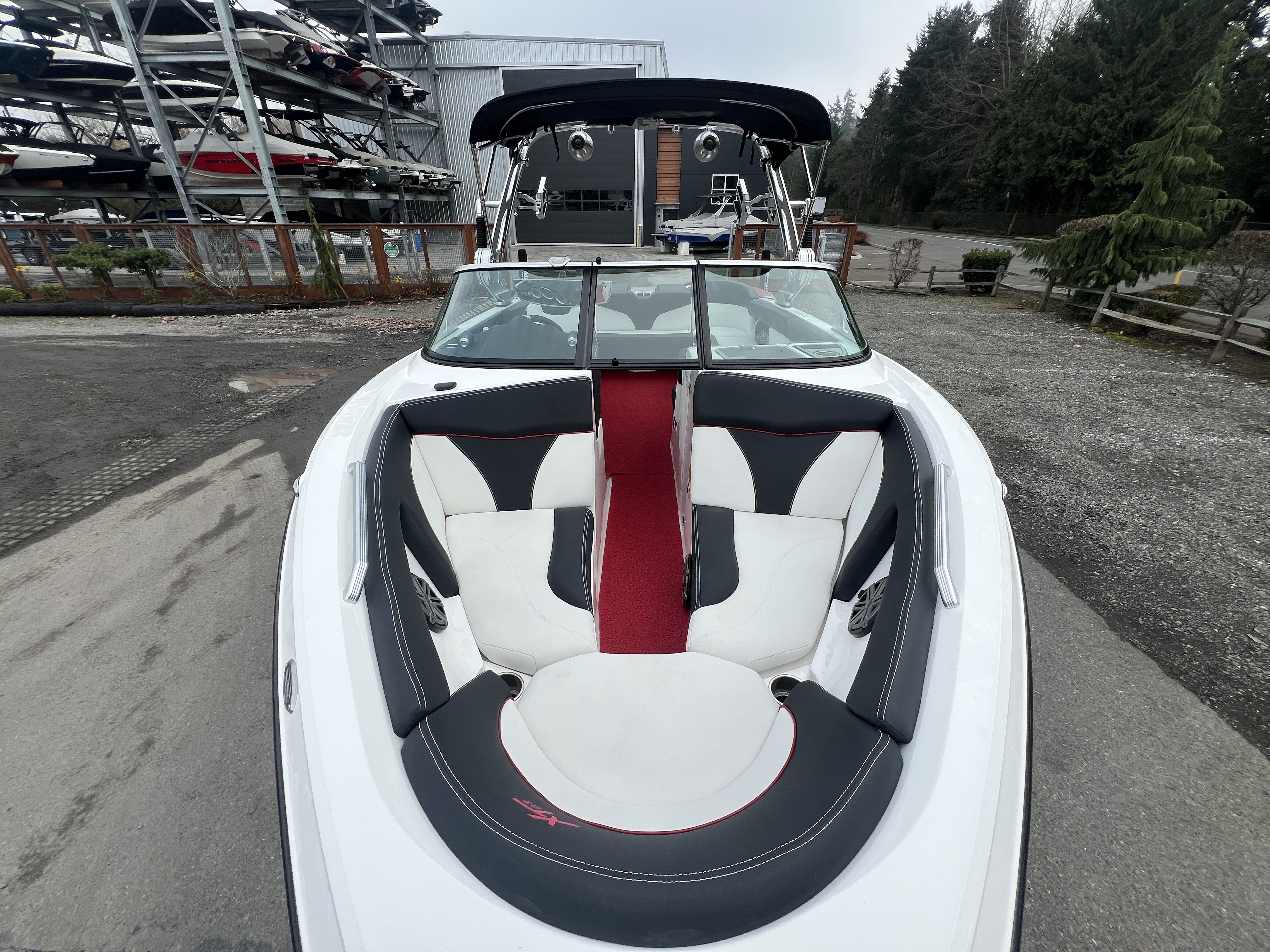 2017 Mastercraft XT23 (Red, Black, White) in Like New Condition, Powered by a 5.3L ILMOR 5500GDI with 365HP and 692 Hours. This boat's options include: Gen 2 Surf System, 2 Rear Soft Ballast Bags, Center Hard Ballast Tank, Retractable Tower, Dual Board Racks, Folding Bimini (Black), 2 JL Tower Speakers, JL Bow and Cockpit Speakers, Fusion Audio System, Rear Facing Flip Up Seats, Heating System, Decadence Flooring, Dual Battery Switch Trailer Available But Not Included